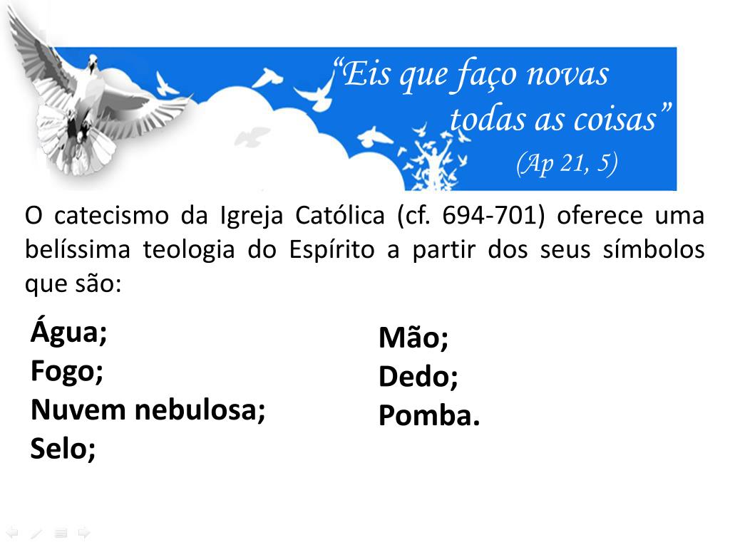 “Eis que faço novas todas as coisas” (Ap 21, 5) O catecismo da Igreja Católica (cf. 694-701) oferece uma belíssima teologia do Espírito a partir dos seus símbolos que são: Água; Fogo; Nuvem nebulosa; Selo; Mão; Dedo; Pomba.