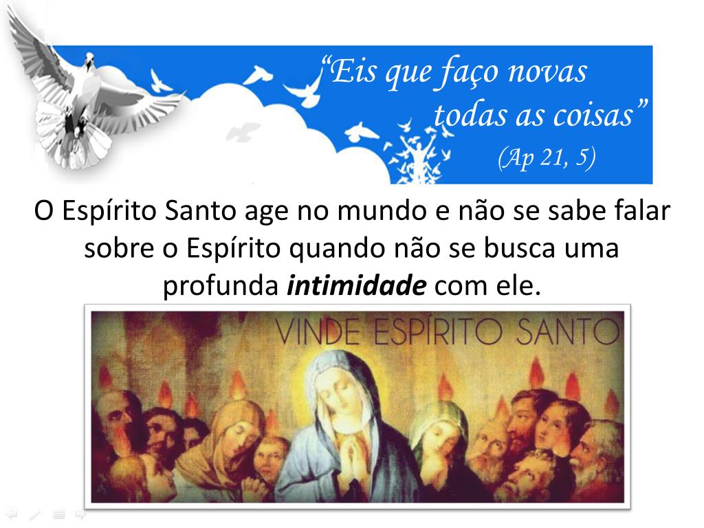 “Eis que faço novas todas as coisas” (Ap 21, 5) O Espírito Santo age no mundo e não se sabe falar sobre o Espírito quando não se busca uma profunda intimidade com ele.