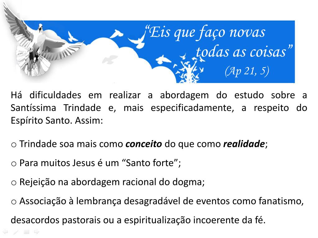 “Eis que faço novas todas as coisas” (Ap 21, 5) • Há dificuldades em realizar a abordagem do estudo sobre a Santíssima Trindade e, mais especificadamente, a respeito do Espírito Santo. Assim: • Trindade soa mais como conceito do que como realidade; • Para muitos Jesus é um “Santo forte”; • Rejeição na abordagem racional do dogma; • Associação à lembrança desagradável de eventos como fanatismo, desacordos pastorais ou a espiritualização incoerente da fé.