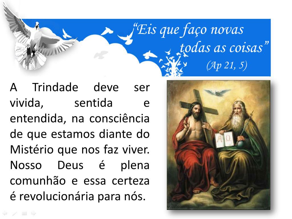 “Eis que faço novas todas as coisas” (Ap 21, 5) A Trindade deve ser vivida, sentida e entendida, na consciência de que estamos diante do Mistério que nos faz viver. Nosso Deus é plena comunhão e essa certeza é revolucionária para nós.
