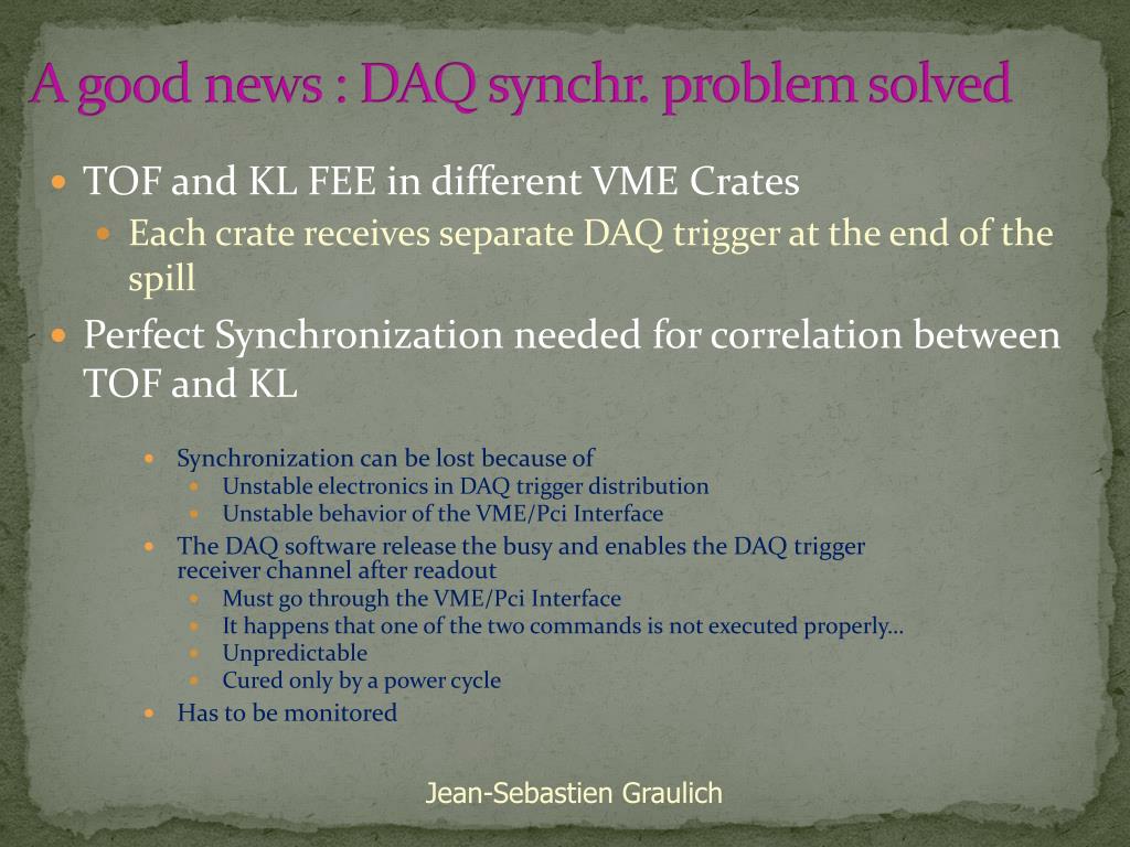 A good news : DAQ synchr. problem solved • TOF and KL FEE in different VME Crates • Each crate receives separate DAQ trigger at the end of the spill • Perfect Synchronization needed for correlation between TOF and KL • Synchronization can be lost because of • Unstable electronics in DAQ trigger distribution • Unstable behavior of the VME/Pci Interface • The DAQ software release the busy and enables the DAQ trigger receiver channel after readout • Must go through the VME/Pci Interface • It happens that one of the two commands is not executed properly… • Unpredictable • Cured only by a power cycle • Has to be monitored Jean-SebastienGraulich