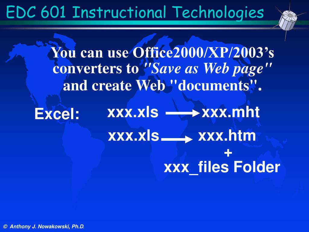 EDC 601Instructional Technologies xxx.xls xxx.mht xxx.xls xxx.htm + xxx_files Folder You can use Office2000/XP/2003’s converters to "Save as Web page"and create Web "documents". Excel: