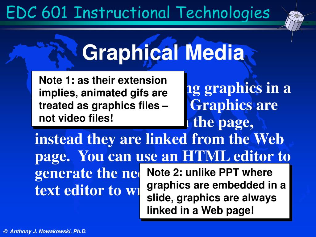 EDC 601Instructional Technologies Graphical Media Note 1: as their extension implies, animated gifs are treated as graphics files – not video files! As we have seen, placing graphics in a Web page is different. Graphics are NOT embedded within the page, instead they are linked from the Web page. You can use an HTML editor to generate the necessary code, or use a text editor to write the code. Note 2: unlike PPT where graphics are embedded in a slide, graphics are always linked in a Web page!