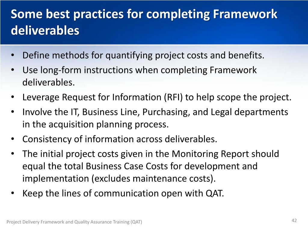 Some best practices for completing Framework deliverables • Define methods for quantifying project costs and benefits. • Use long-form instructions when completing Framework deliverables. • Leverage Request for Information (RFI) to help scope the project. • Involve the IT, Business Line, Purchasing, and Legal departments in the acquisition planning process. • Consistency of information across deliverables. • The initial project costs given in the Monitoring Report should equal the total Business Case Costs for development and implementation (excludes maintenance costs). • Keep the lines of communication open with QAT. Project Delivery Framework and Quality Assurance Training (QAT)