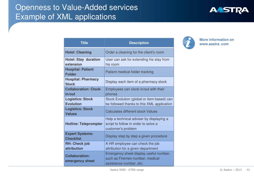 XML & phones • XML (eXtensible Markup) is a language similar to HTML • XML was created to display information and focuses on data description • XML allows to dissociate content from presentation • This allows, for example, display the same document on different devices or applications without the need to create as many versions of the document that we need to represent The entire 6700i range natively supports XML to provide value-added applications Aastra 5000 - 6700i range