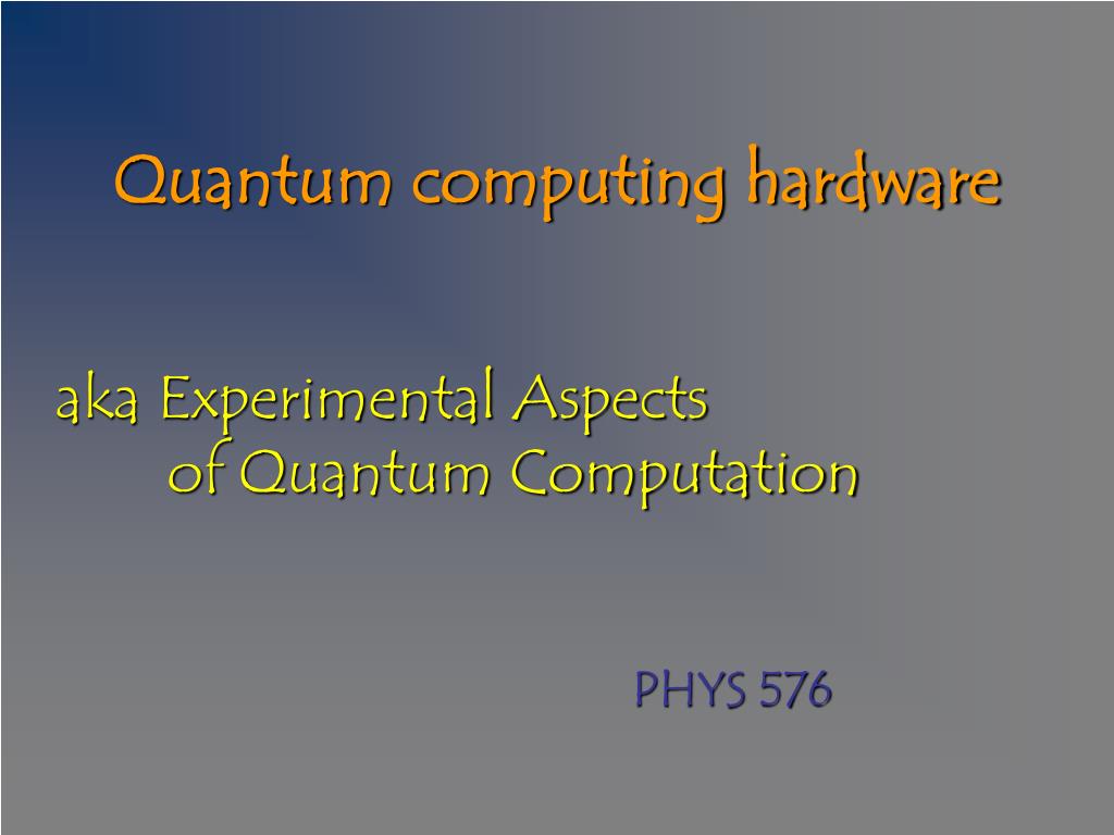 Quantum computing hardware. aka Experimental Aspects of Quantum Computation. PHYS 576. Class format. 1 st hour: introduction by BB 2 nd and 3 rd hour: two student presentations, about 40 minutes each followed by discussions