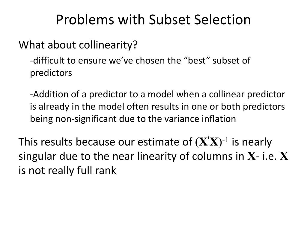 Problems with Subset Selection What about collinearity? -difficult to ensure we’ve chosen the “best” subset of predictors -Addition of a predictor to a model when a collinear predictor is already in the model often results in one or both predictors being non-significant due to the variance inflation This results because our estimate of (X’X)-1 is nearly singular due to the near linearity of columns in X- i.e. X is not really full rank
