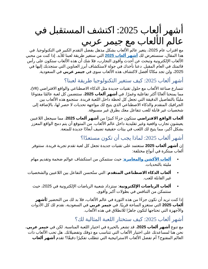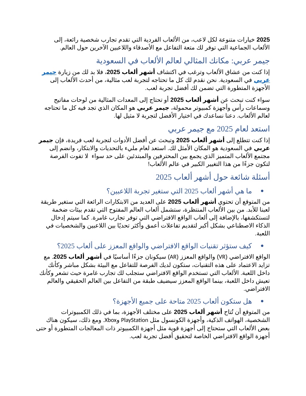 u0645u0639 u0627u0642u062au0631u0627u0628 u0639u0627u0645 2025u060c u064au062au063au064au0631 u0639u0627u0644u0645 u0627u0644u0623u0644u0639u0627u0628 u0628u0634u0643u0644 u0645u0630u0647u0644 u0628u0641u0636u0644 u0627u0644u062au0642u062fu0645 u0627u0644u0643u0628u064au0631 u0641u064a u0627u0644u062au0643u0646u0648u0644u0648u062cu064au0627. u0641u064a u0647u0630u0627 u0627u0644u0645u0642u0627u0644u060c u0633u0646u0633u062au0639u0631u0636 u0644u0643 u0623u0634u0647u0631 u0623u0644u0639u0627u0628 2025 u0627u0644u062au064a u0633u062au063au064au0631 u0637u0631u064au0642u0629 u0644u0639u0628u0646u0627 u0644u0644u0623u0628u062f. u0625u0630u0627 u0643u0646u062a u0645u0646 u0645u062du0628u064a u0627u0644u0623u0644u0639u0627u0628 u0627u0644u0625u0644u0643u062au0631u0648u0646u064au0629 u0648u062au0628u062du062b u0639u0646 u0623u062du062fu062b u0648u0623u0642u0648u0649 u0627u0644u062au062cu0627u0631u0628u060c u0641u0644u0627 u0634u0643 u0623u0646 u0647u0630u0647 u0627u0644u0623u0644u0639u0627u0628 u0633u062au0643u0648u0646 u0639u0644u0649 u0631u0623u0633 u0642u0627u0626u0645u062au0643 u0641u064a u0627u0644u0639u0627u0645 u0627u0644u0645u0642u0628u0644. u062fu0639u0646u0627 u0646u0623u062eu0630u0643 u0641u064a u062cu0648u0644u0629 u0644u0627u0633u062au0643u0634u0627u0641 u0623u0628u0631u0632 u0627u0644u0639u0646u0627u0648u064au0646 u0627u0644u062au064a u0633u062au062cu0630u0628u0643 u0625u0644u064au0647u0627 u0641u064a 2025u060c u0648u0644u0646 u062au062cu062f u0645u0643u0627u0646u064bu0627 u0623u0641u0636u0644 u0644u0627u0643u062au0634u0627u0641 u0647u0630u0647 u0627u0644u0623u0644u0639u0627u0628 u0633u0648u0649 u0641u064a u062cu064au0645u0631 u0639u0631u0628u064a u0641u064a u0627u0644u0633u0639u0648u062fu064au0629.