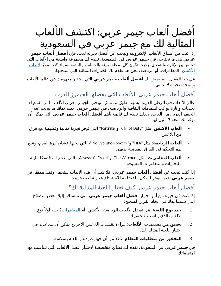باعلألا فشتكا يبرع رميج باعلأ لضفأ ةيدوعسلا يف يبرع رميج عم كل ةيلاثملا نإف ،بعل ةبرجت لضفأ نع ثحبتو ةينورتكللإا باعللأا قاشع نم تنك اذإ رميج باعلأ لضفأ يتلا باعللأا نم ةعساو ةعومجم كل مدقن ،ةيدوعسلا يف . ا9بحم تنك ءاوس ةعتملاو سامحلاب ةئيلم ةظحل لك نوكت ثيحب ،يدحتلاو ةراثلإا نيب عمجت باعللأ . اهبحتس يتلا ةيلاثملا تارايخلا كل مدقن انه نحن ،ةضايرلا وأ ،تارماغملا ، : يبرع رميج يف هجاتحت ام يه يبرع نشكلأا . باعللأا ملاع نع كموهفم ريغتس يتلا يبرع رميج باعلأ لضفأ كل ضرعتسن ،لاقملا اذه يف . ىسنNت لا ةبرجت كحنمتو برعلا زرميجلا اهلضفي يتلا باعللأا يبرع رميج باعلأ لضفأ : هل مدقت يتلا باعللأا يبرعلا رميجلا بحيو ،ا9رمتسم ا9روطت دهشي يبرعلا نطولا يف باعللأا ملاع . هنع ثحبي ام ا9مامت ملعن ، يبرع رميج باعلأ لضفأ نأ نكمي يتلا يبرع رميج يف ةيضايرلاو ةيفاقثلا هتامامتها بكاوت ةراثإو تايدحت مهأب ةمئاق كل مدقن كلذلو ،باعلأ نم يبرعلا رميجلا اهل ليثم لا ةعتم كل رفوت : Fortnite " Call of Duty " " و قرف عم ةيكيتكتو ةيلاتق ةبرجت رفوت يتلا لثم نشكلأا باعلأ . نيبعلالا نم " : Pro Evolution Soccer " FIFA حيتتو ،مدقلا ةرك قاشع اهبحي يتلا ، " " و لثم ةضايرلا باعلأ " : مهيدل ةلضفملا قرفلا يف مكحتلا مهل . Assassin's Creed " The Witcher " " و ةئيلم ا9صًصًق كل مدقت يتلا ، لثم تارماغملا باعلأ " : ةقوشملا تارماغملاو تايدحتلاب . يف ا9عتمم كتقو لعجتس باعللأا هذه نأ كش لاف ، يبرع رميج باعلأ لضفأ نع ثحبت تنك اذإ يبرع رميج . ةديرف بعل ةبرجتب عاتمتسلال هجاتحت ام لك كل رفون نحن ، . ؟كل ةيلاثملا ةبعللا راتخت فيك يبرع رميج باعلأ لضفأ : حئاصًنلا ضعب كيلإ ،كبسانت يتلا يبرع رميج باعلأ لضفأ رايتخا رمأ نم ةريح يف تنك اذإ حيحصًلا رارقلا ذاختا يف كدعاستس يتلا : عون9لاوأ ددح ؟ مأ ،نشكلأا ،ةيضايرلا باعللأا لضفت له تارماغملا ةبعللا عون ددح : 1 . كتيصًخش بساني يذلا باعللأا . يف كدعاسي نأ نكمي نيرخلآا نيبعلالا تامييقت ةءارق باعللأا تامييقت نم ققحت . كل ةيلاثملا ةبعللا رايتخا : 2 . ةسلاسب ةبعللا معدي كزاهج نأ نم دكأت ماظنلا تابلطتم نم ققحتلا . : 3 . عم بسانتت يتلا باعللأا لضفأ رايتخلا ةصًصًختم حئاصًن كل مدقن ،ةيدوعسلا يف يبرع رميج يف .كتامامتها