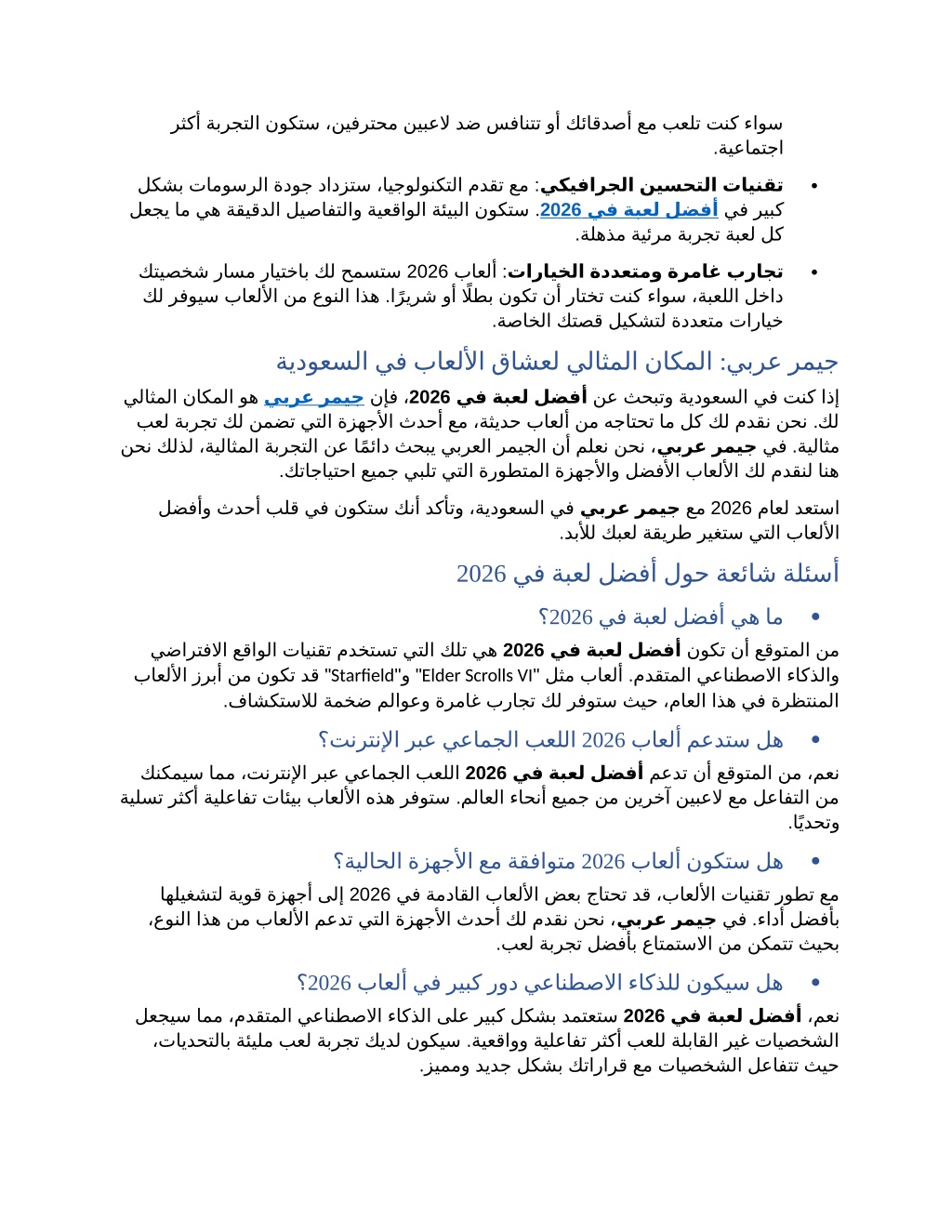 رثكأ ةبرجتلا نوكتس ،نيفرتحم نيبعلا دض سفانتت وأ كئاقدصأ عم بعلت تنك ءاوس .ةيعامتجا لكشب تاموسرلا ةدوج دادزتس ،ايجولونكتلا مدقت عم لعجي ام يه ةقيقدلا ليصافتلاو ةيعقاولا ةئيبلا نوكتس يكيفارجلا نيسحتلا تاينقت يف ةبعل لضفأ 2026 . . ةلهذم ةيئرم ةبرجت ةبعل لك : يف ريبك كتيصخش راسم رايتخاب كل حمستس كل رفويس باعللأا نم عونلا اذه اUريرش وأUلاطب نوكت نأ راتخت تنك ءاوس ،ةبعللا لخاد تارايخلا ةددعتمو ةرماغ براجت : باعلأ . ةصاخلا كتصق ليكشتل ةددعتم تارايخ 2026 . ةيدوعسلا يف باعللأا قاشعل يلاثملا ناكملا يبرع رميج : يلاثملا ناكملا وه بعل ةبرجت كل نمضت يتلا ةزهجلأا ثدحأ عم ،ةثيدح باعلأ نم هجاتحت ام لك كل مدقن نحن كل نحن كلذل ،ةيلاثملا ةبرجتلا نع اUمئاد ثحبي يبرعلا رميجلا نأ ملعن نحن ، يبرع رميج . كتاجايتحا عيمج يبلت يتلا ةروطتملا ةزهجلأاو لضفلأا باعللأا كل مدقنل انه نإف ، يف ةبعل لضفأ نع ثحبتو ةيدوعسلا يف تنك اذإ يبرع رميج 2026 . يف ةيلاثم . لضفأو ثدحأ بلق يف نوكتس كنأ دكأتو ،ةيدوعسلا يف يبرع رميج دبلأل كبعل ةقيرط ريغتس يتلا باعللأا 2026 عم ماعل دعتسا . يف ةبعل لضفأ لوح ةعئاش ةلئسأ 2026 2026 ؟ يف ةبعل لضفأ يه ام يضارتفلاا عقاولا تاينقت مدختست يتلا كلت يه باعللأا زربأ نم نوكت دق . فاشكتسلال ةمخض ملاوعو ةرماغ براجت كل رفوتس ثيح ،ماعلا اذه يف ةرظتنملا يف ةبعل لضفأ نوكت نأ عقوتملا نم Starfield " 2026 لثم باعلأ مدقتملا يعانطصلاا ءاكذلاو . Elder Scrolls VI " " و " ؟تنرتنلإا ربع يعامجلا بعللا باعلأ معدتس له 2026 كنكميس امم ،تنرتنلإا ربع يعامجلا بعللا ةيلست رثكأ ةيلعافت تائيب باعللأا هذه رفوتس ملاعلا ءاحنأ عيمج نم نيرخآ نيبعلا عم لعافتلا نم يف ةبعل لضفأ معدت نأ عقوتملا نم ،معن 2026 . .اUيدحتو ؟ةيلاحلا ةزهجلأا عم ةقفاوتم باعلأ نوكتس له 2026 اهليغشتل ةيوق ةزهجأ ىلإ ،عونلا اذه نم باعللأا معدت يتلا ةزهجلأا ثدحأ كل مدقن نحن ، يف ةمداقلا باعللأا ضعب جاتحت دق ،باعللأا تاينقت روطت عم يبرع رميج . بعل ةبرجت لضفأب عاتمتسلاا نم نكمتت ثيحب 2026 يف ءادأ لضفأب . 2026 ؟ باعلأ يف ريبك رود يعانطصلاا ءاكذلل نوكيس له لعجيس امم ،مدقتملا يعانطصلاا ءاكذلا ىلع ريبك لكشب دمتعتس ،تايدحتلاب ةئيلم بعل ةبرجت كيدل نوكيس ةيعقاوو ةيلعافت رثكأ بعلل ةلباقلا ريغ تايصخشلا . زيممو ديدج لكشب كتارارق عم تايصخشلا لعافتت ثيح يف ةبعل لضفأ ،معن 2026 .