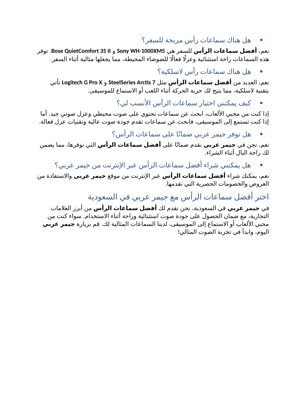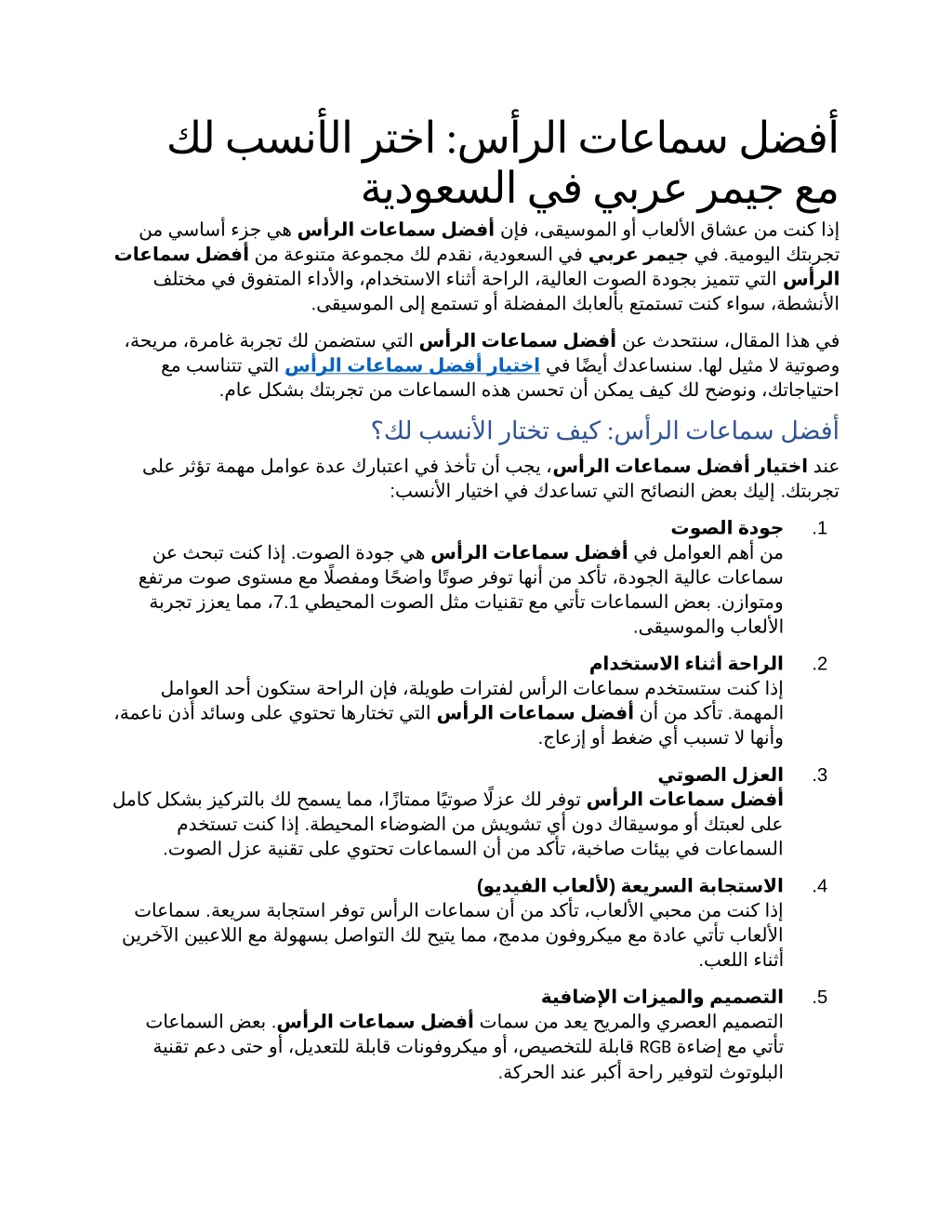 كل بسنألا رتخا سأرلا تاعامس لضفأ ةيدوعسلا يف يبرع رميج عم نإف ،ىقيسوملا وأ باعللأا قاشع نم تنك اذإ سأرلا تاعامس لضفأ نم يساسأ ءزج يه نم ةعونتم ةعومجم كل مدقن ،ةيدوعسلا يف تاعامس لضفأ فلتخم يف قوفتملا ءادلأاو ،مادختسلاا ءانثأ ةحارلا ،ةيلاعلا توصلا ةدوجب زيمتت يتلا . ىقيسوملا ىلإ عمتست وأ ةلضفملا كباعلأب عتمتست تنك ءاوس ،ةطشنلأا : يف ةيمويلا كتبرجت يبرع رميج . سأرلا ،ةحيرم ،ةرماغ ةبرجت كل نمضتس يتلا عم بسانتت يتلا . سأرلا تاعامس لضفأ نع ثدحتنس ،لاقملا اذه يف . يف اFضيأ كدعاسنس اهل ليثم لا ةيتوصو سأرلا تاعامس لضفأ رايتخا ماع لكشب كتبرجت نم تاعامسلا هذه نسحت نأ نكمي فيك كل حضونو ،كتاجايتحا ؟كل بسنلأا راتخت فيك سأرلا تاعامس لضفأ : ىلع رثؤت ةمهم لماوع ةدع كرابتعا يف ذخأت نأ بجي ، سأرلا تاعامس لضفأ رايتخا دنع بسنلأا رايتخا يف كدعاست يتلا حئاصنلا ضعب كيلإ كتبرجت : . توصلا ةدوج يف لماوعلا مهأ نم . ىقيسوملاو باعللأا 1 . نع ثحبت تنك اذإ توصلا ةدوج يه عفترم توص ىوتسم عمFلًاصفمو اFحضاو اFتوص رفوت اهنأ نم دكأت ،ةدوجلا ةيلاع تاعامس يطيحملا توصلا لثم تاينقت عم يتأت تاعامسلا ضعب نزاوتمو 7.1 ةبرجت ززعي امم ، سأرلا تاعامس لضفأ . . مادختسلاا ءانثأ ةحارلا نأ نم دكأت ةمهملا جاعزإ وأ طغض يأ ببست لا اهنأو . 2 . لماوعلا دحأ نوكتس ةحارلا نإف ،ةليوط تارتفل سأرلا تاعامس مدختستس تنك اذإ سأرلا تاعامس لضفأ ،ةمعان نذأ دئاسو ىلع يوتحت اهراتخت يتلا . يتوصلا لزعلا 3 . لماك لكشب زيكرتلاب كل حمسي امم ،اFزاتمم اFيتوصFلازع كل رفوت . مدختست تنك اذإ ةطيحملا ءاضوضلا نم شيوشت يأ نود كاقيسوم وأ كتبعل ىلع . توصلا لزع ةينقت ىلع يوتحت تاعامسلا نأ نم دكأت ،ةبخاص تائيب يف تاعامسلا سأرلا تاعامس لضفأ ويديفلا باعللأ ةعيرسلا ةباجتسلاا ) ( 4 . تاعامس ةعيرس ةباجتسا رفوت سأرلا تاعامس نأ نم دكأت ،باعللأا يبحم نم تنك اذإ نيرخلآا نيبعلًالا عم ةلوهسب لصاوتلا كل حيتي امم ،جمدم نوفوركيم عم ةداع يتأت باعللأا . بعللا ءانثأ . ةيفاضلإا تازيملاو ميمصتلا تامس نم دعي حيرملاو يرصعلا ميمصتلا . ةكرحلا دنع ربكأ ةحار ريفوتل ثوتولبلا 5 . تاعامسلا ضعب ةينقت معد ىتح وأ ،ليدعتلل ةلباق تانوفوركيم وأ ،صيصختلل ةلباق سأرلا تاعامس لضفأ . RGB ةءاضإ عم يتأت