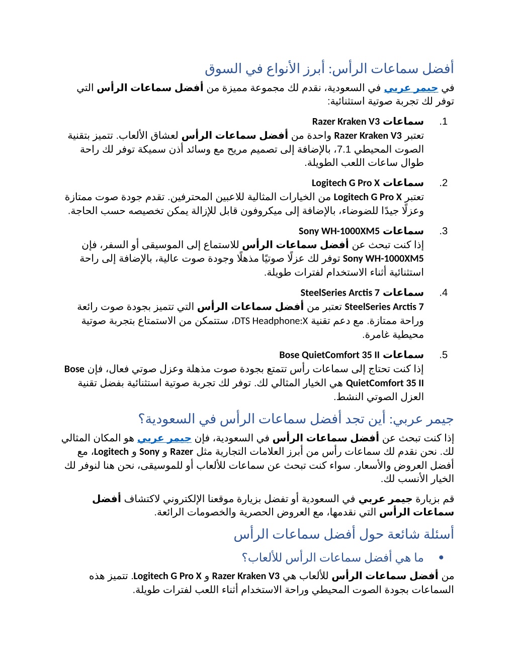 قوسلا يف عاونلأا زربأ سأرلا تاعامس لضفأ : سأرلا تاعامس لضفأ يتلا نم ةزيمم ةعومجم كل مدقن ،ةيدوعسلا يف يبرع رميج يف ةيئانثتسا ةيتوص ةبرجت كل رفوت : Razer Kraken V3 Razer Kraken V3 نم ةدحاو 7.1 . ةليوطلا بعللا تاعاس لاوط تاعامس ربتعت 1 . ةينقتب زيمتت باعللأا قاشعل ةحار كل رفوت ةكيمس نذأ دئاسو عم حيرم ميمصت ىلإ ةفاضلإاب ، سأرلا تاعامس لضفأ . يطيحملا توصلا Logitech G Pro X Logitech G Pro X تاعامس ربتعت 2 . ةزاتمم توص ةدوج مدقت نيفرتحملا نيبعلًال ةيلاثملا تارايخلا نم . ةجاحلا بسح هصيصخت نكمي ةلازلإل لباق نوفوركيم ىلإ ةفاضلإاب ،ءاضوضلل اFديجFلازعو . Sony WH-1000XM5 ةليوط تارتفل مادختسلاا ءانثأ ةيئانثتسا تاعامس 3 . نإف ،رفسلا وأ ىقيسوملا ىلإ عامتسلًال ةحار ىلإ ةفاضلإاب ،ةيلاع توص ةدوجوFلًاهذم اFيتوصFلازع كل رفوت سأرلا تاعامس لضفأ . نع ثحبت تنك اذإ Sony WH-1000XM5 SteelSeries Arctis 7 نم ربتعت ةينقت معد عم ةزاتمم ةحارو . تاعامس 4 . SteelSeries Arctis 7 . ةرماغ ةيطيحم ةعئار توص ةدوجب زيمتت يتلا ةيتوص ةبرجتب عاتمتسلاا نم نكمتتس ، سأرلا تاعامس لضفأ DTS Headphone:X Bose QuietComfort 35 II تاعامس 5 . Bose نإف ،لاعف يتوص لزعو ةلهذم توص ةدوجب عتمتت سأر تاعامس ىلإ جاتحت تنك اذإ . ةينقت لضفب ةيئانثتسا ةيتوص ةبرجت كل رفوت كل يلاثملا رايخلا يه QuietComfort 35 II طشنلا يتوصلا لزعلا . ؟ةيدوعسلا يف سأرلا تاعامس لضفأ دجت نيأ يبرع رميج : يلاثملا ناكملا وه Logitech عم ، نإف ،ةيدوعسلا يف لثم ةيراجتلا تاملًاعلا زربأ نم سأر تاعامس كل مدقن نحن كل كل رفونل انه نحن ،ىقيسوملل وأ باعللأل تاعامس نع ثحبت تنك ءاوس راعسلأاو ضورعلا لضفأ يبرع رميج و Sony و سأرلا تاعامس لضفأ نع ثحبت تنك اذإ . كل بسنلأا رايخلا Razer . . لضفأ فاشتكلا ينورتكللإا انعقوم ةرايزب لضفت وأ ةيدوعسلا يف . ةعئارلا تاموصخلاو ةيرصحلا ضورعلا عم ،اهمدقن يتلا يبرع رميج سأرلا تاعامس ةرايزب مق سأرلا تاعامس لضفأ لوح ةعئاش ةلئسأ ؟باعللأل سأرلا تاعامس لضفأ يه ام Logitech G Pro X . . ةليوط تارتفل بعللا ءانثأ مادختسلاا ةحارو يطيحملا توصلا ةدوجب تاعامسلا Razer Kraken V3 و هذه زيمتت يه باعللأل سأرلا تاعامس لضفأ نم