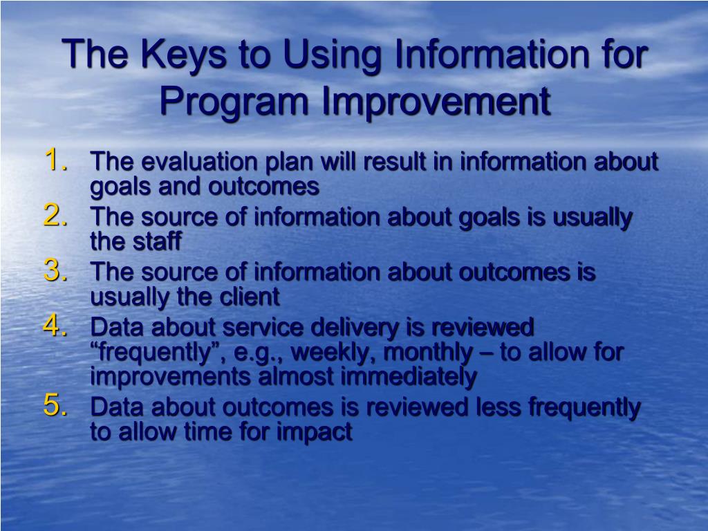 The Keys to Using Information for Program Improvement • The evaluation plan will result in information about goals and outcomes • The source of information about goals is usually the staff • The source of information about outcomes is usually the client • Data about service delivery is reviewed “frequently”, e.g., weekly, monthly – to allow for improvements almost immediately • Data about outcomes is reviewed less frequently to allow time for impact