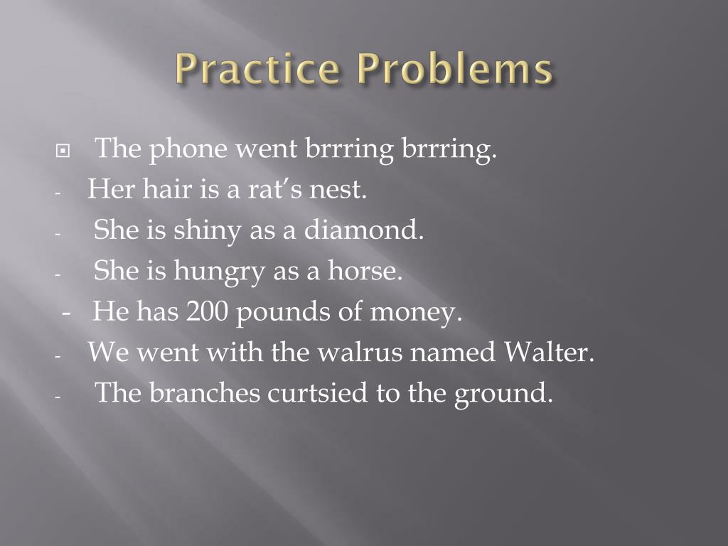 Practice Problems • The phone went brrringbrrring. • Her hair is a rat’s nest. • She is shiny as a diamond. • She is hungry as a horse. - He has 200 pounds of money. • We went with the walrus named Walter. • The branches curtsied to the ground.