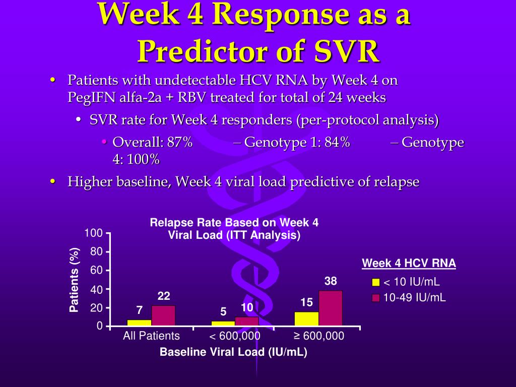 Time to Undetectable HCV RNA Identified as Best Predictor of SVR • Pooled data from PegIFN alfa-2b/RBV and PegIFN alfa-2a/RBV phase III trials PPV of HCV RNA Undetectability Determining SVR 100 86 80 76 80 PPV for SVR (%) 60 40 20 0 Week 4 Week 12 Week 24 Time to Undetectable HCV RNA