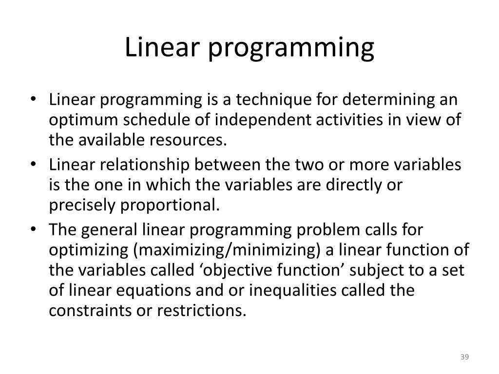 Linear programming • Linear programming is a technique for determining an optimum schedule of independent activities in view of the available resources. • Linear relationship between the two or more variables is the one in which the variables are directly or precisely proportional. • The general linear programming problem calls for optimizing (maximizing/minimizing) a linear function of the variables called ‘objective function’ subject to a set of linear equations and or inequalities called the constraints or restrictions.