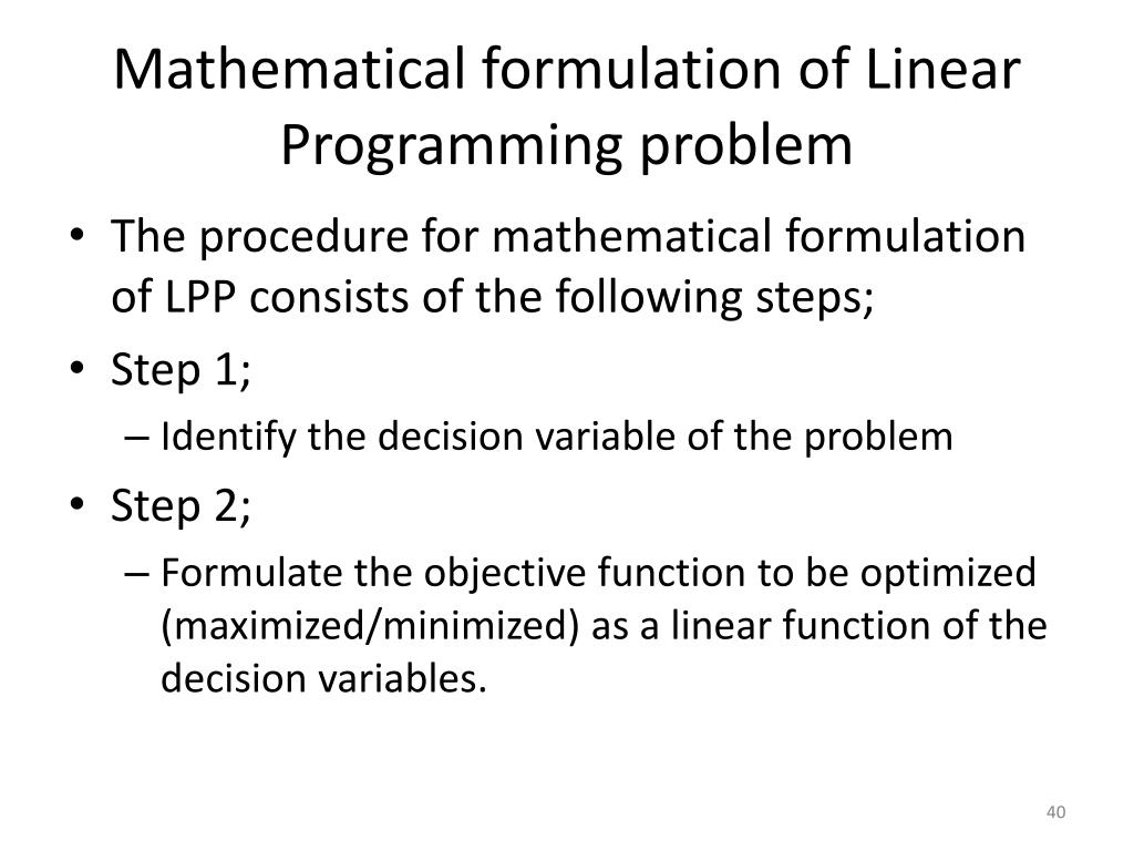 Mathematical formulation of Linear Programming problem • The procedure for mathematical formulation of LPP consists of the following steps; • Step 1; • Identify the decision variable of the problem • Step 2; • Formulate the objective function to be optimized (maximized/minimized) as a linear function of the decision variables.