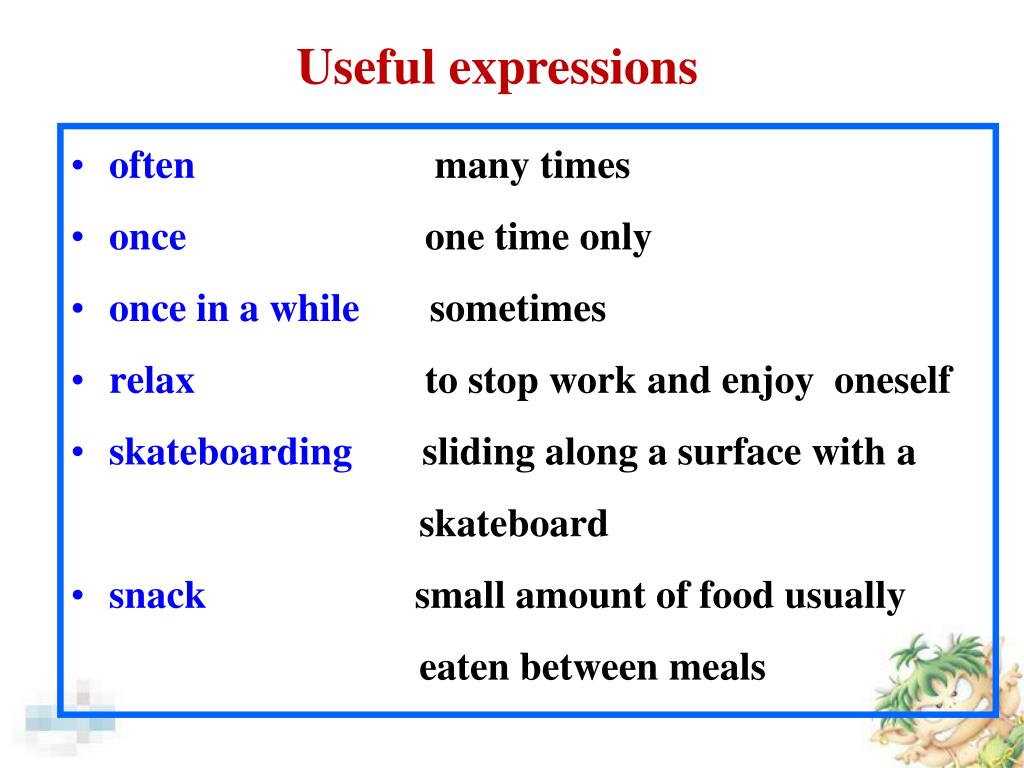 often many times once one time only once in a while sometimes relax to stop work and enjoy oneself skateboarding sliding along a surface with a skateboard snack small amount of food usually eaten between meals Useful expressions