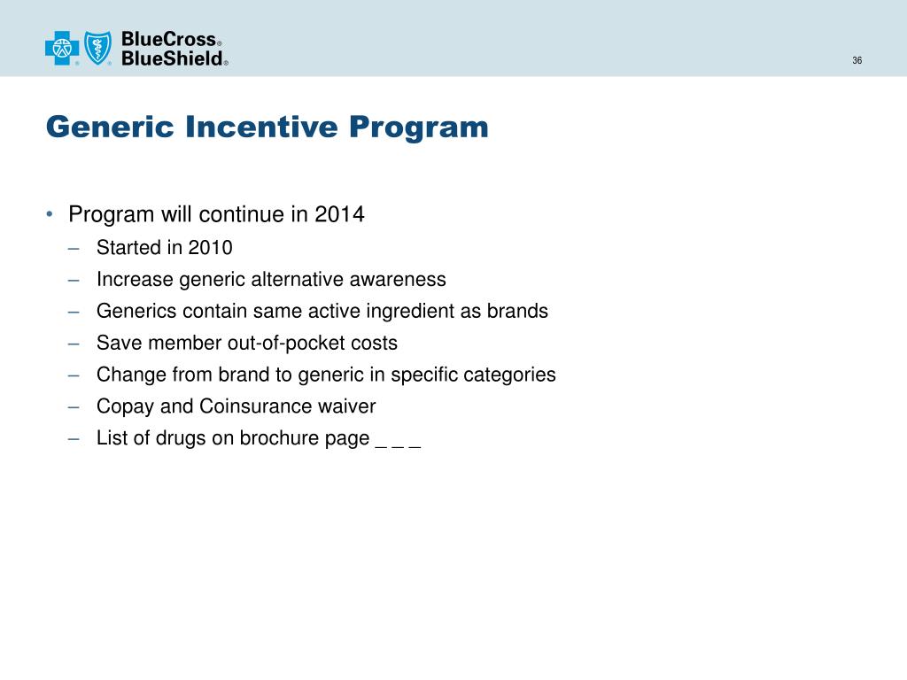 Generic Incentive Program • Program will continue in 2014 • Started in 2010 • Increase generic alternative awareness • Generics contain same active ingredient as brands • Save member out-of-pocket costs • Change from brand to generic in specific categories • Copay and Coinsurance waiver • List of drugs on brochure page _ _ _