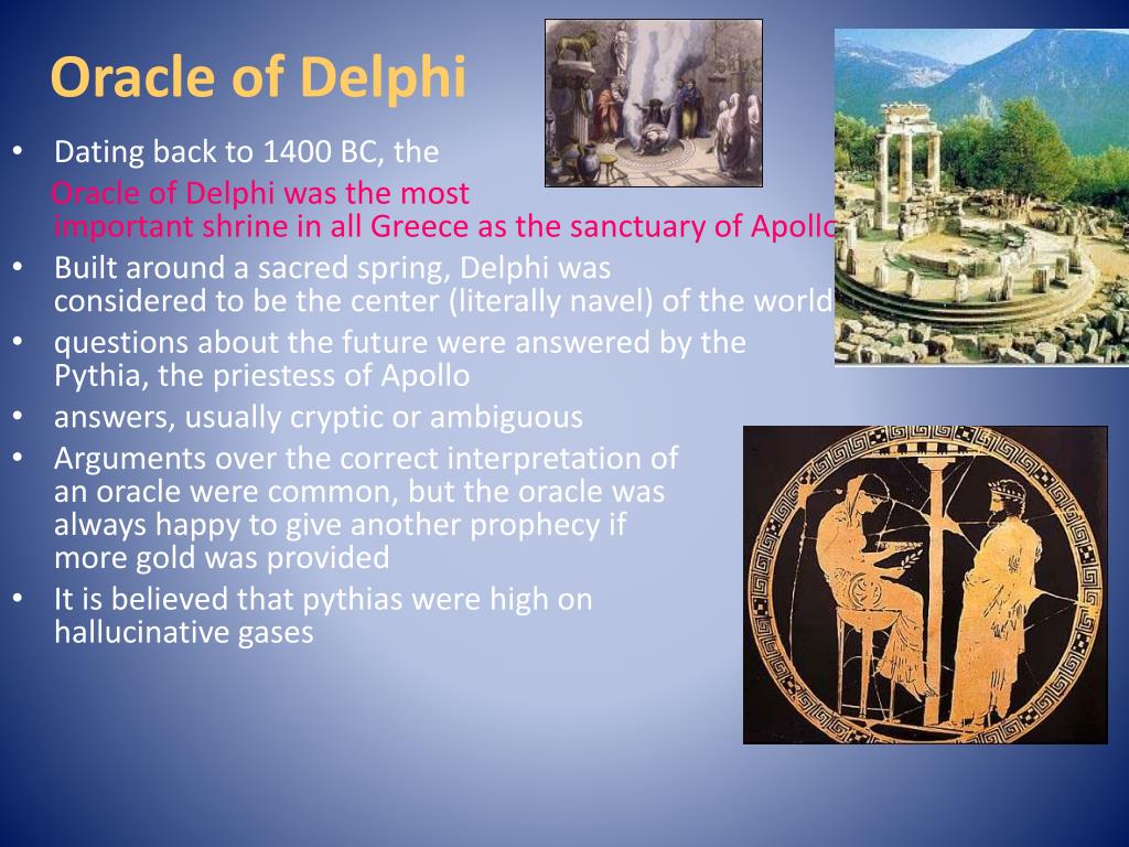 Oracle of Delphi • Dating back to 1400 BC, the Oracle of Delphi was the most important shrine in all Greece as the sanctuary of Apollo • Built around a sacred spring, Delphi wasconsidered to be the center (literally navel) of the world • questions about the future were answered by the Pythia, the priestess of Apollo • answers, usually cryptic or ambiguous • Arguments over the correct interpretation ofan oracle were common, but the oracle was always happy to give another prophecy ifmore gold was provided • It is believed that pythias were high on hallucinative gases