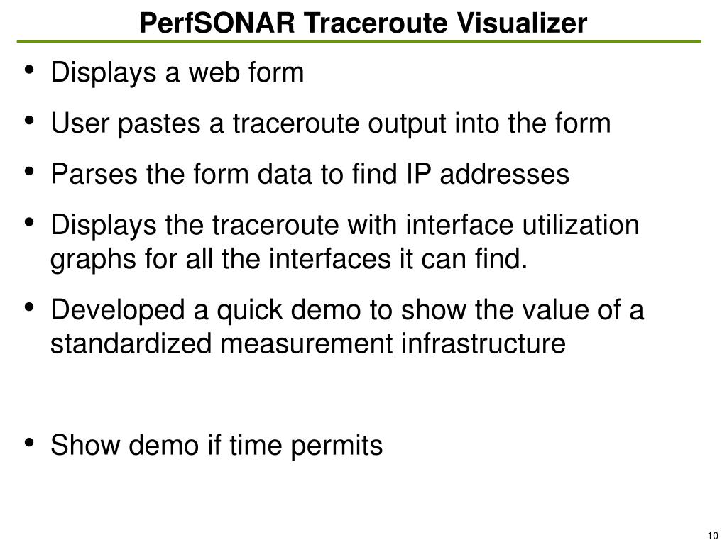 PerfSONAR Traceroute Visualizer • Displays a web form • User pastes a traceroute output into the form • Parses the form data to find IP addresses • Displays the traceroute with interface utilization graphs for all the interfaces it can find. • Developed a quick demo to show the value of a standardized measurement infrastructure • Show demo if time permits