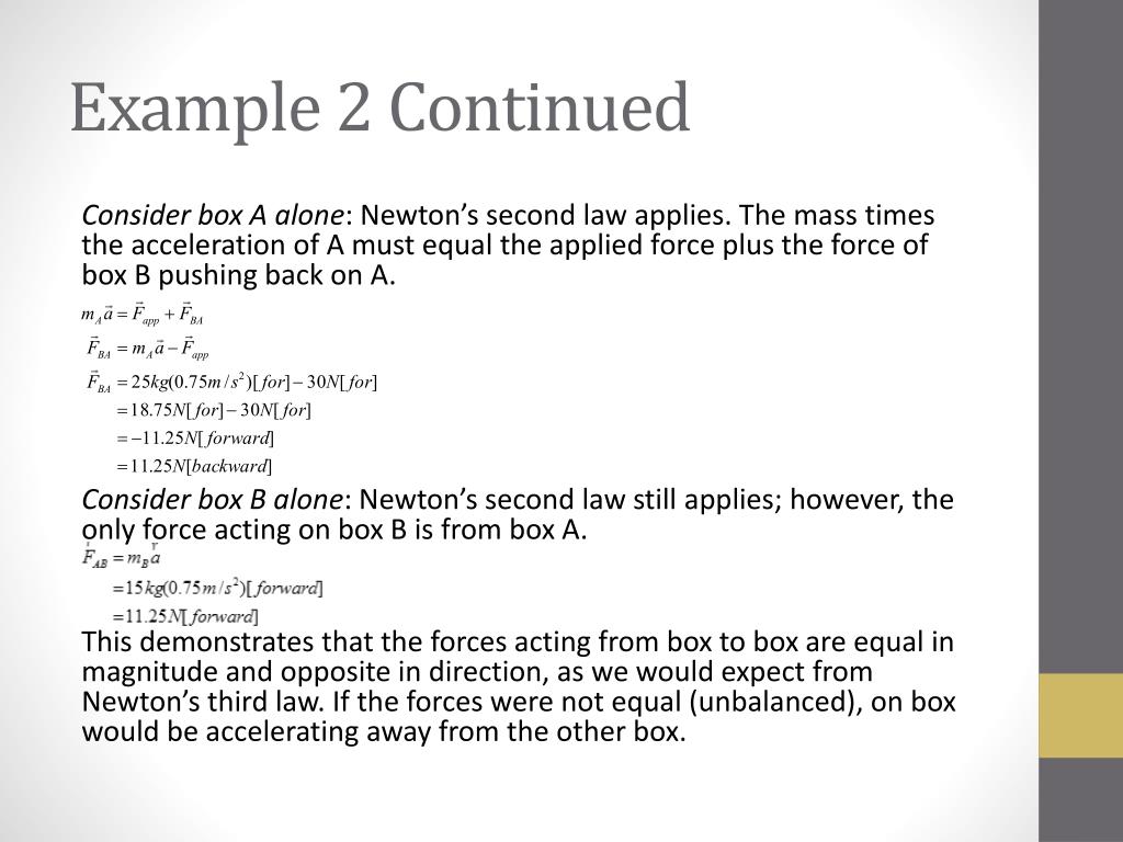 Example 2 Continued Consider box A alone: Newton’s second law applies. The mass times the acceleration of A must equal the applied force plus the force of box B pushing back on A. Consider box B alone: Newton’s second law still applies; however, the only force acting on box B is from box A. This demonstrates that the forces acting from box to box are equal in magnitude and opposite in direction, as we would expect from Newton’s third law. If the forces were not equal (unbalanced), on box would be accelerating away from the other box.