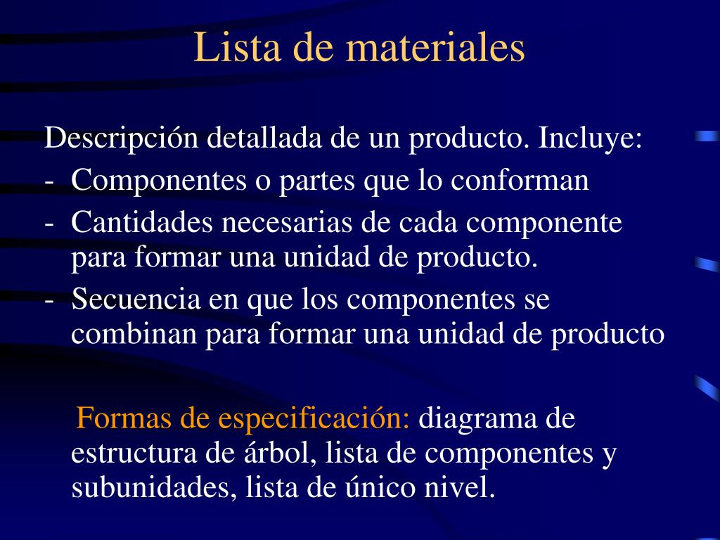 Lista de materiales Descripción detallada de un producto. Incluye: • Componentes o partes que lo conforman • Cantidades necesarias de cada componente para formar una unidad de producto. • Secuencia en que los componentes se combinan para formar una unidad de producto Formas de especificación: diagrama de estructura de árbol, lista de componentes y subunidades, lista de único nivel.