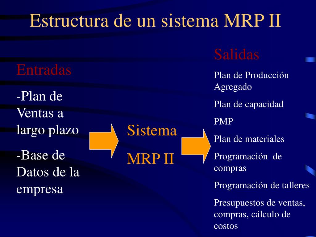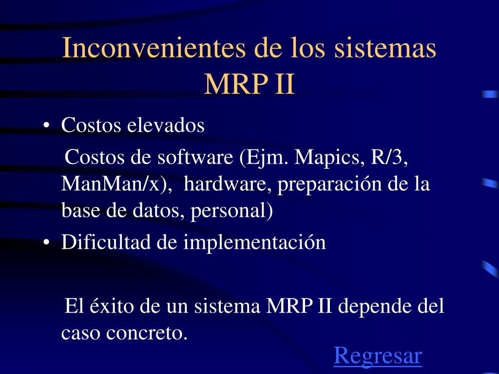 Inconvenientes de los sistemas MRP II • Costos elevados Costos de software (Ejm. Mapics, R/3, ManMan/x), hardware, preparación de la base de datos, personal) • Dificultad de implementación El éxito de un sistema MRP II depende del caso concreto. Regresar