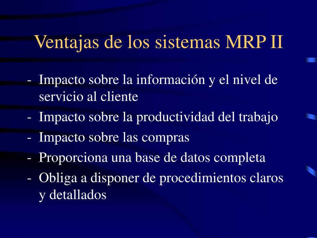Ventajas de los sistemas MRP II • Impacto sobre la información y el nivel de servicio al cliente • Impacto sobre la productividad del trabajo • Impacto sobre las compras • Proporciona una base de datos completa • Obliga a disponer de procedimientos claros y detallados