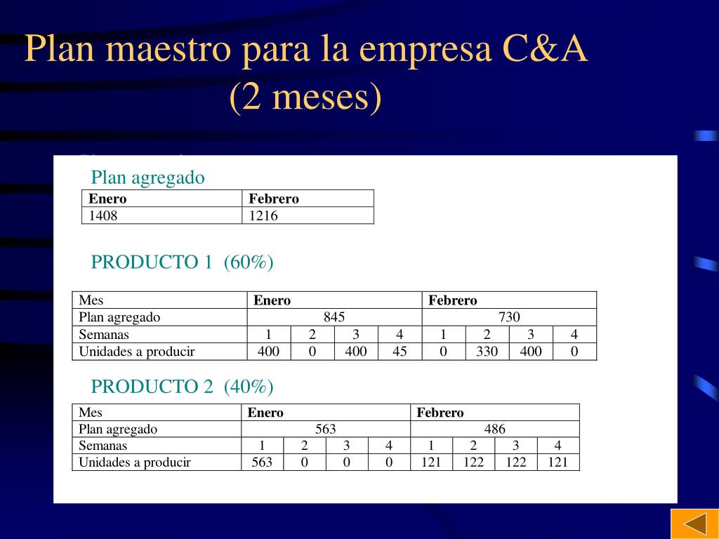 Plan maestro para la empresa C&A (2 meses) Plan agregado Plan agregado PRODUCTO 1 PRODUCTO 1 (60%) PRODUCTO 2 PRODUCTO 2 (40%)