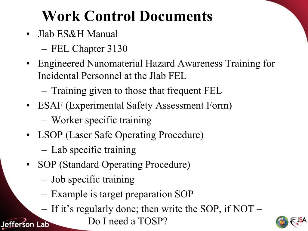 Work Control Documents • Jlab ES&H Manual • FEL Chapter 3130 • Engineered Nanomaterial Hazard Awareness Training for Incidental Personnel at the Jlab FEL • Training given to those that frequent FEL • ESAF (Experimental Safety Assessment Form) • Worker specific training • LSOP (Laser Safe Operating Procedure) • Lab specific training • SOP (Standard Operating Procedure) • Job specific training • Example is target preparation SOP • If it’s regularly done; then write the SOP, if NOT – Do I need a TOSP?