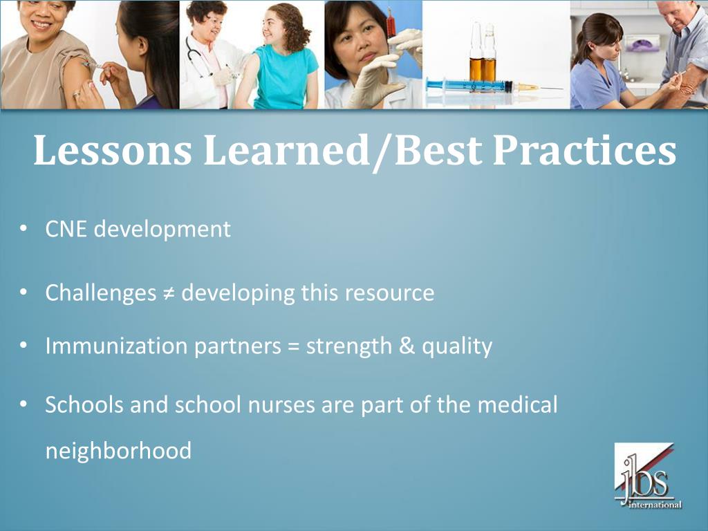Lessons Learned/Best Practices • CNE development • Challenges ≠ developing this resource • Immunization partners = strength & quality • Schools and school nurses are part of the medical neighborhood