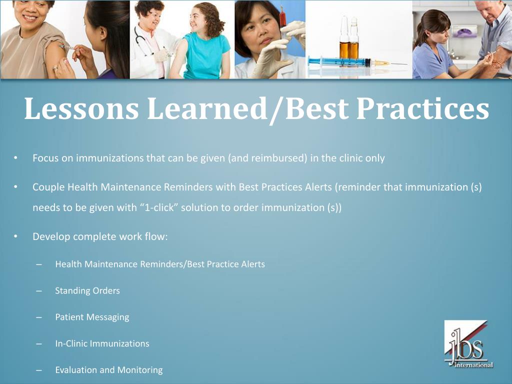 Lessons Learned/Best Practices • Focus on immunizations that can be given (and reimbursed) in the clinic only • Couple Health Maintenance Reminders with Best Practices Alerts (reminder that immunization (s) needs to be given with “1-click” solution to order immunization (s)) • Develop complete work flow: • Health Maintenance Reminders/Best Practice Alerts • Standing Orders • Patient Messaging • In-Clinic Immunizations • Evaluation and Monitoring