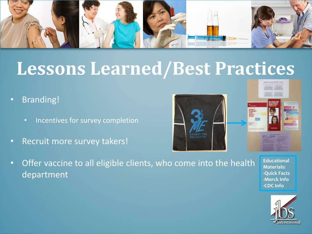Lessons Learned/Best Practices • Branding! • Incentives for survey completion • Recruit more survey takers! • Offer vaccine to all eligible clients, who come into the health department Educational Materials: -Quick Facts -Merck Info -CDC Info