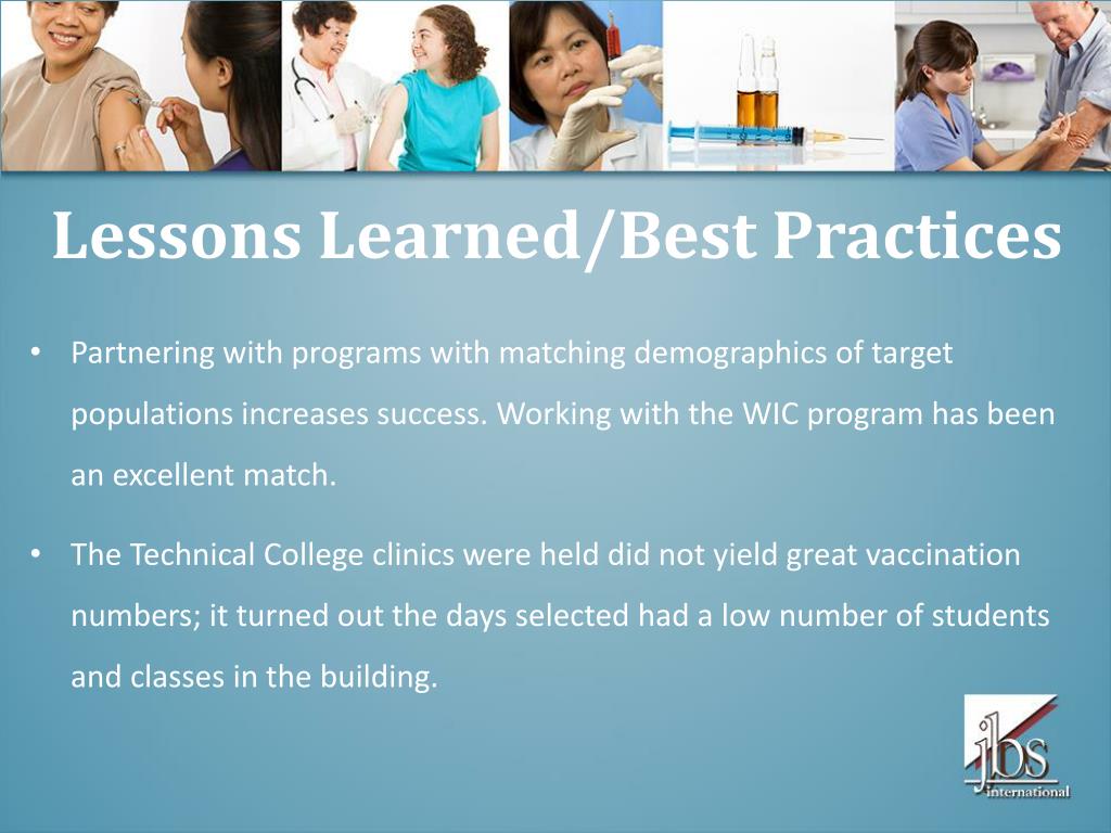 Lessons Learned/Best Practices • Partnering with programs with matching demographics of target populations increases success. Working with the WIC program has been an excellent match. • The Technical College clinics were held did not yield great vaccination numbers; it turned out the days selected had a low number of students and classes in the building.