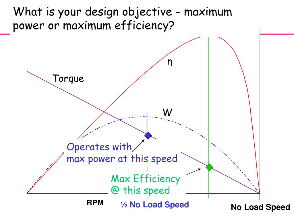 What is your design objective - maximum power or maximum efficiency? Operates with max power at this speed Max Efficiency @ this speed ½ No Load Speed η Torque W No Load Speed