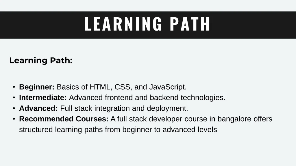 LEARNING PATH Learning Path: • Beginner: Basics of HTML, CSS, and JavaScript. • Intermediate: Advanced frontend and backend technologies. • Advanced: Full stack integration and deployment. • Recommended Courses: A full stack developer course in bangalore offers structured learning paths from beginner to advanced levels