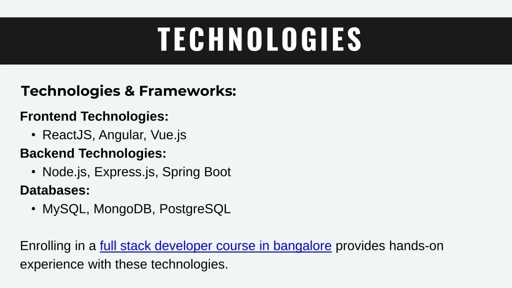 TECHNOLOGIES • Technologies & Frameworks: • Frontend Technologies: • ReactJS, Angular, Vue.js • Backend Technologies: • Node.js, Express.js, Spring Boot • Databases: • MySQL, MongoDB, PostgreSQL • Enrolling in a full stack developer course in bangalore provides hands-on experience with these technologies.