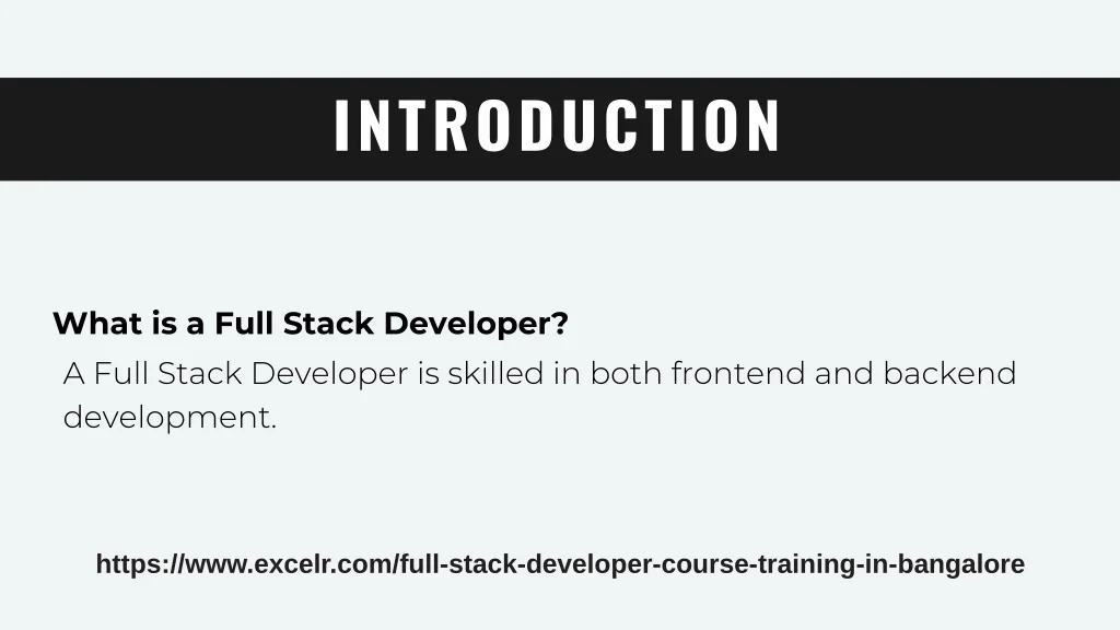 What is a Full Stack Developer? INTRODUCTION A Full Stack Developer is skilled in both frontend and backend development. https://www.excelr.com/full-stack-developer-course-training-in-bangalore