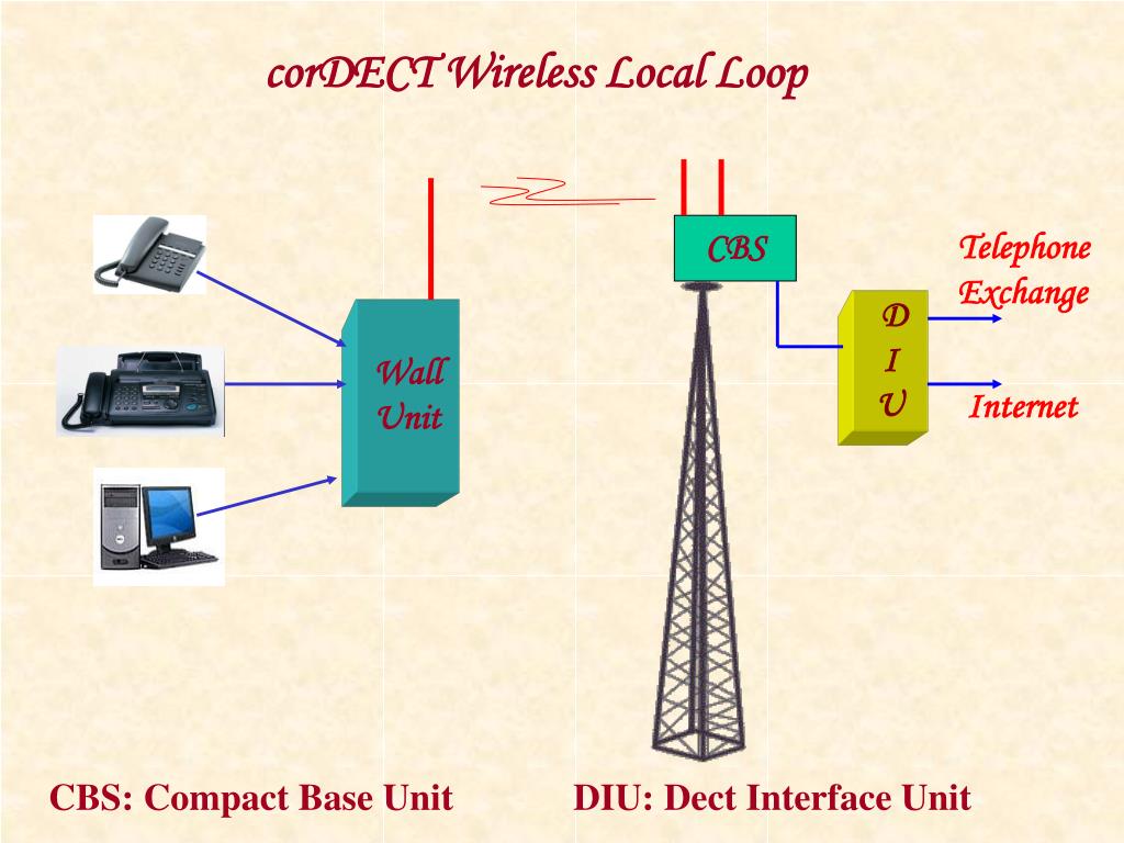 corDECT Wireless Local Loop CBS Telephone Exchange D I U Wall Unit Internet CBS: Compact Base Unit DIU: Dect Interface Unit