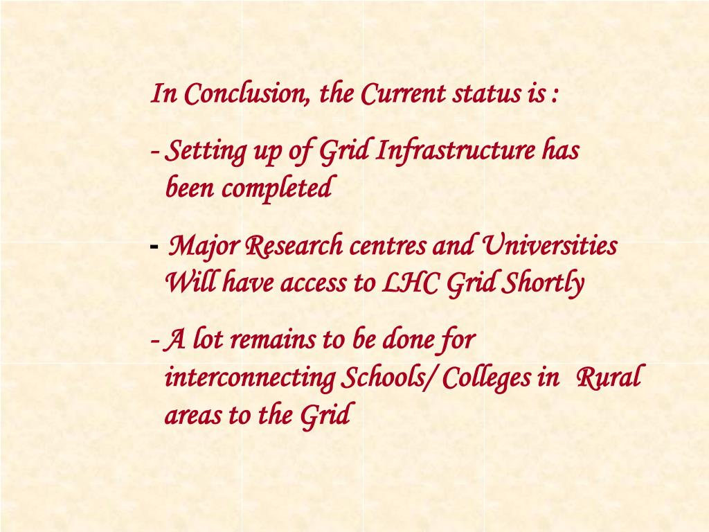 In Conclusion, the Current status is : - Setting up of Grid Infrastructure has been completed - Major Research centres and Universities Will have access to LHC Grid Shortly - A lot remains to be done for interconnecting Schools/ Colleges in Rural areas to the Grid