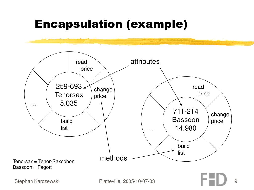read price read price 259-693 Tenorsax 5.035 711-214 Bassoon 14.980 change price change price ... ... build list build list Encapsulation (example) attributes methods Tenorsax = Tenor-Saxophon Bassoon = Fagott Platteville, 2005/10/07-03