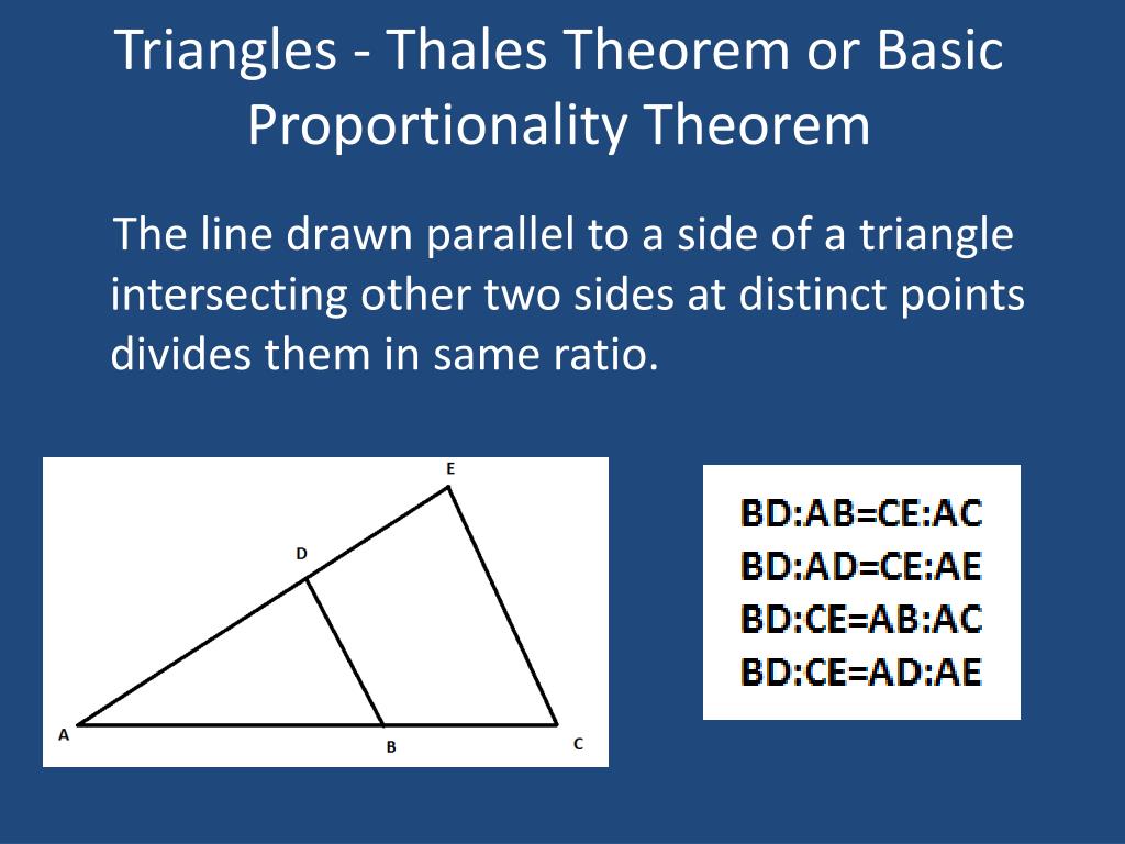 Triangles - Thales Theorem or Basic Proportionality Theorem The line drawn parallel to a side of a triangle intersecting other two sides at distinct points divides them in same ratio.