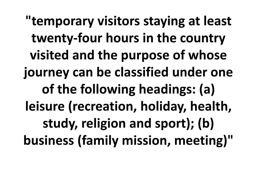 "temporary visitors staying at least twenty-four hours in the country visited and the purpose of whose journey can be classified under one of the following headings: (a) leisure (recreation, holiday, health, study, religion and sport); (b) business (family mission, meeting)"