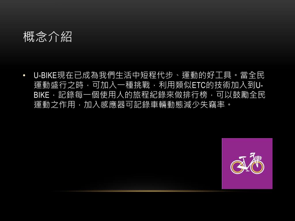 概念介紹 • U-BIKE現在已成為我們生活中短程代步、運動的好工具。當全民運動盛行之時,可加入一種挑戰,利用類似ETC的技術加入到U-BIKE,記錄每一個使用人的旅程紀錄來做排行榜,可以鼓勵全民運動之作用,加入感應器可記錄車輛動態減少失竊率。