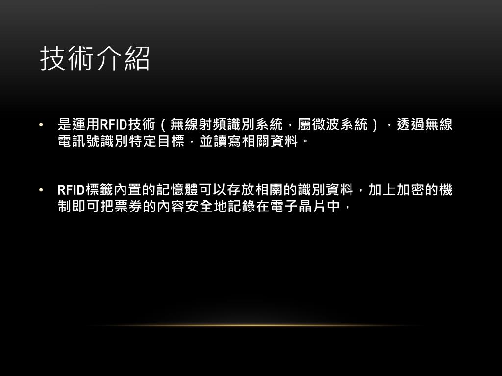 技術介紹 • 是運用RFID技術(無線射頻識別系統,屬微波系統),透過無線電訊號識別特定目標,並讀寫相關資料。 • RFID標籤內置的記憶體可以存放相關的識別資料,加上加密的機制即可把票券的內容安全地記錄在電子晶片中,