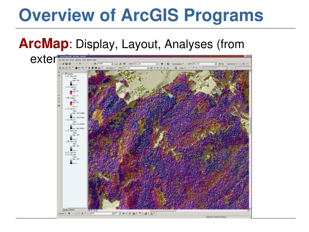 Overview of ArcGIS Programs ArcMap: Display, Layout, Analyses (from extensions)