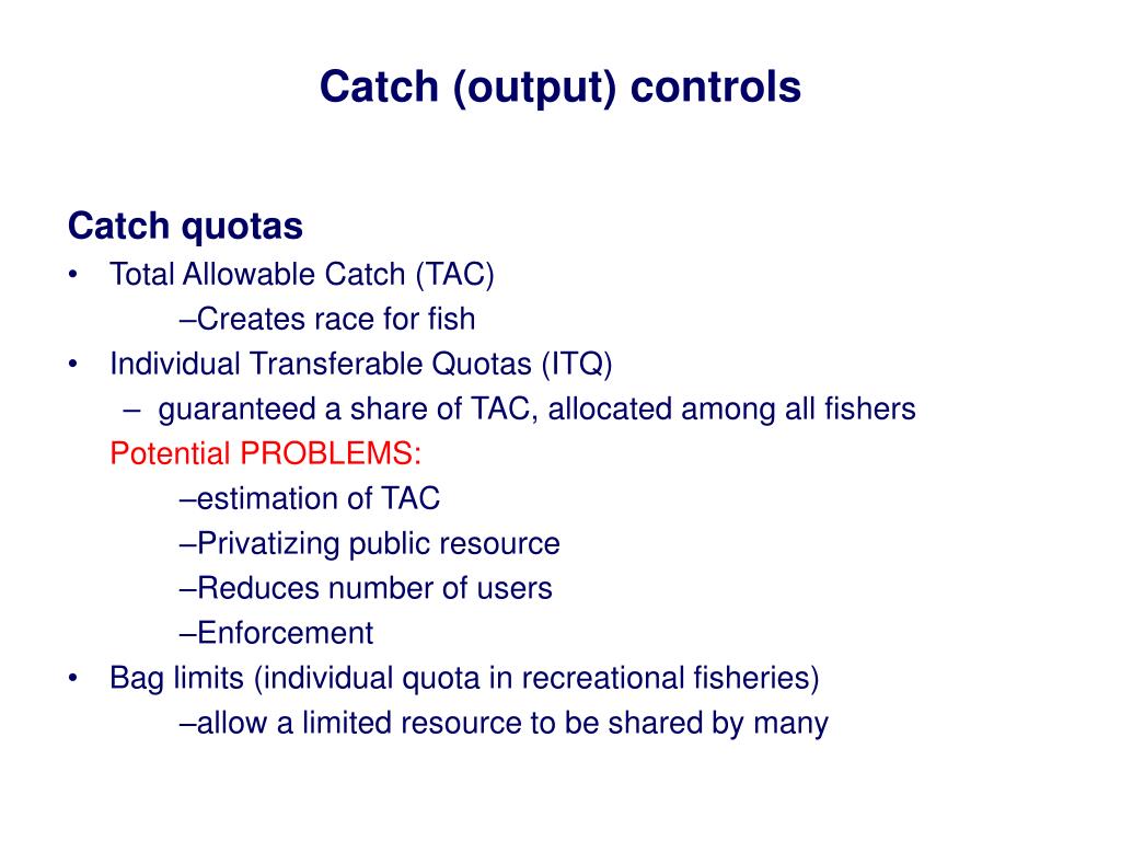 Catch (output) controls Catch quotas • Total Allowable Catch (TAC) –Creates race for fish • Individual Transferable Quotas (ITQ) • guaranteed a share of TAC, allocated among all fishers Potential PROBLEMS: –estimation of TAC –Privatizing public resource –Reduces number of users –Enforcement • Bag limits (individual quota in recreational fisheries) –allow a limited resource to be shared by many