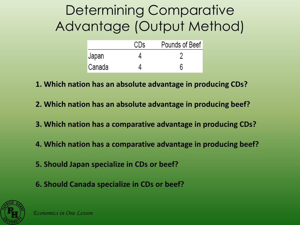Determining ComparativeAdvantage (Output Method) • 1. Which nation has an absolute advantage in producing CDs? • 2. Which nation has an absolute advantage in producing beef? • 3. Which nation has a comparative advantage in producing CDs? • 4. Which nation has a comparative advantage in producing beef? • 5. Should Japan specialize in CDs or beef? • 6. Should Canada specialize in CDs or beef?