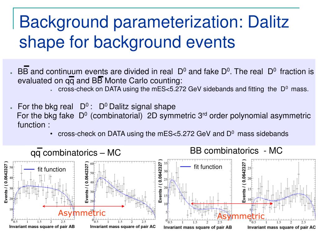 Background parameterization: Dalitz shape for background events • BB and continuum events are divided in real D0 and fake D0. The real D0 fraction is evaluated on qq and BB Monte Carlo counting: • cross-check on DATA using the mES<5.272 GeV sidebands and fitting the D0 mass. • For the bkg real D0 : D0 Dalitz signal shape For the bkg fake D0 (combinatorial) 2D symmetric 3rd order polynomial asymmetric function : • cross-check on DATA using the mES<5.272 GeV and D0 mass sidebands .BB combinatorics - MC .qq combinatorics – MC fit function fit function Asymmetric Asymmetric Nicola Neri - International School of Subnuclear Physics